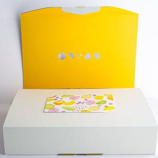 穏やかなパッケージカラーに金の箔押しに4種のフルーツのデザインホール。蓋を開けると目に入るショッキングイエローにメッセージカード。贈る人のセンスを伝え、贈られた人の空間を彩ります。
