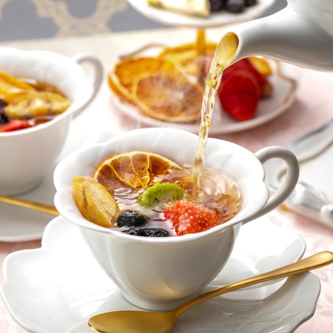 りんご特有の自然の甘さに、みかんのマイルドな酸味、キウイやイチゴの甘酸っぱさが調和し、ウバ紅茶の味わいを引き立てるえいこく屋厳選のドライフルーツティーセットです。