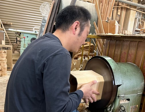 「三方」製作工程で伝統工芸士が削り出す木曽檜の端材を使った枕マット